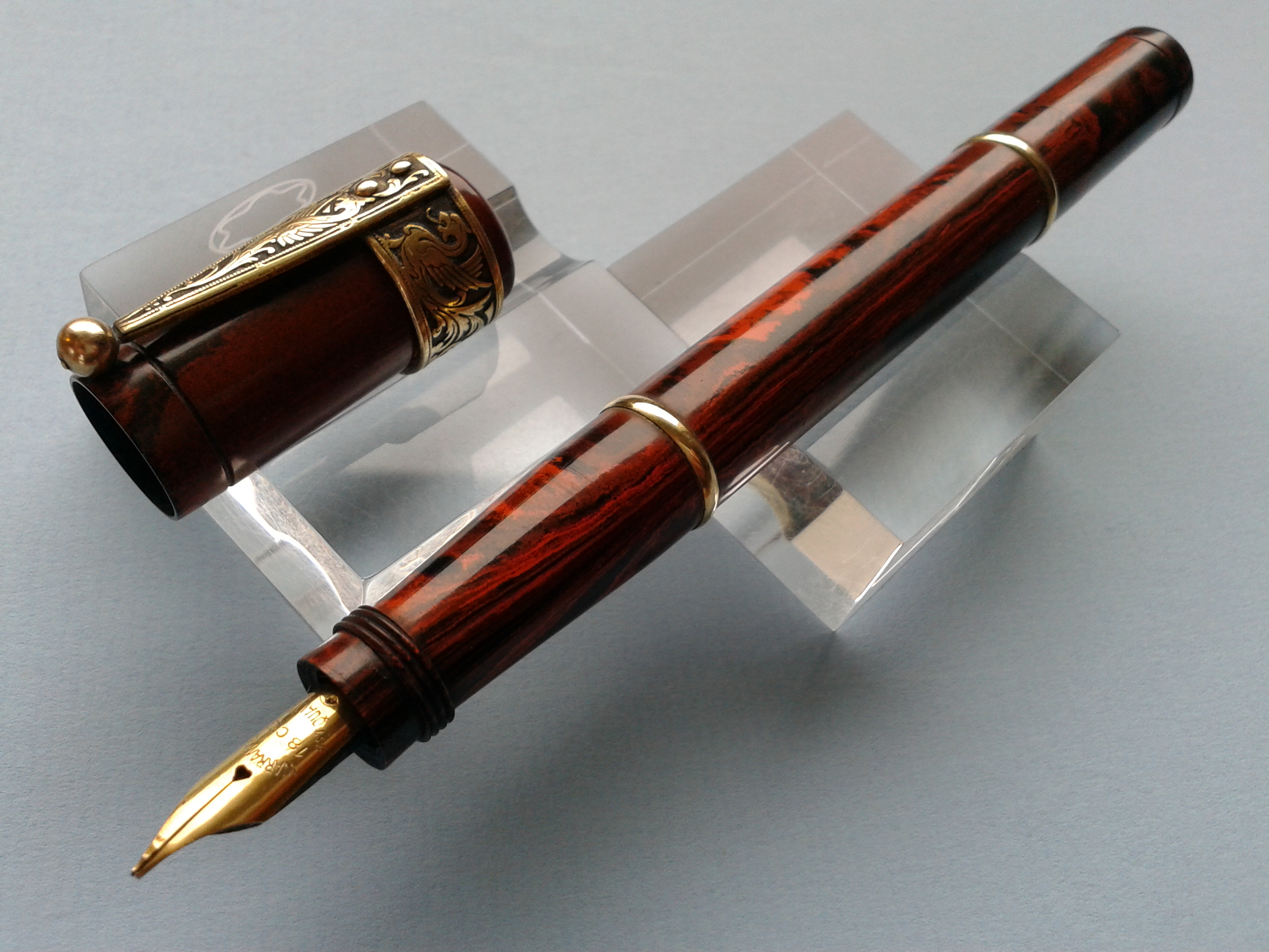 Foto di una penna Swell. Caricamento rientrante. Realizzazione in ebanite fiammata nero e perla. Modello ignoto con anelli e fermaglio di comodo in ottone, marca sconosciuta di origine francese. Contributo di Giorgio (utente forum Musicus).