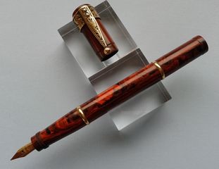 Foto di una penna Swell. Caricamento rientrante. Realizzazione in ebanite fiammata nero e perla. Modello ignoto con anelli e fermaglio di comodo in ottone, marca sconosciuta di origine francese. Contributo di Giorgio (utente forum Musicus).