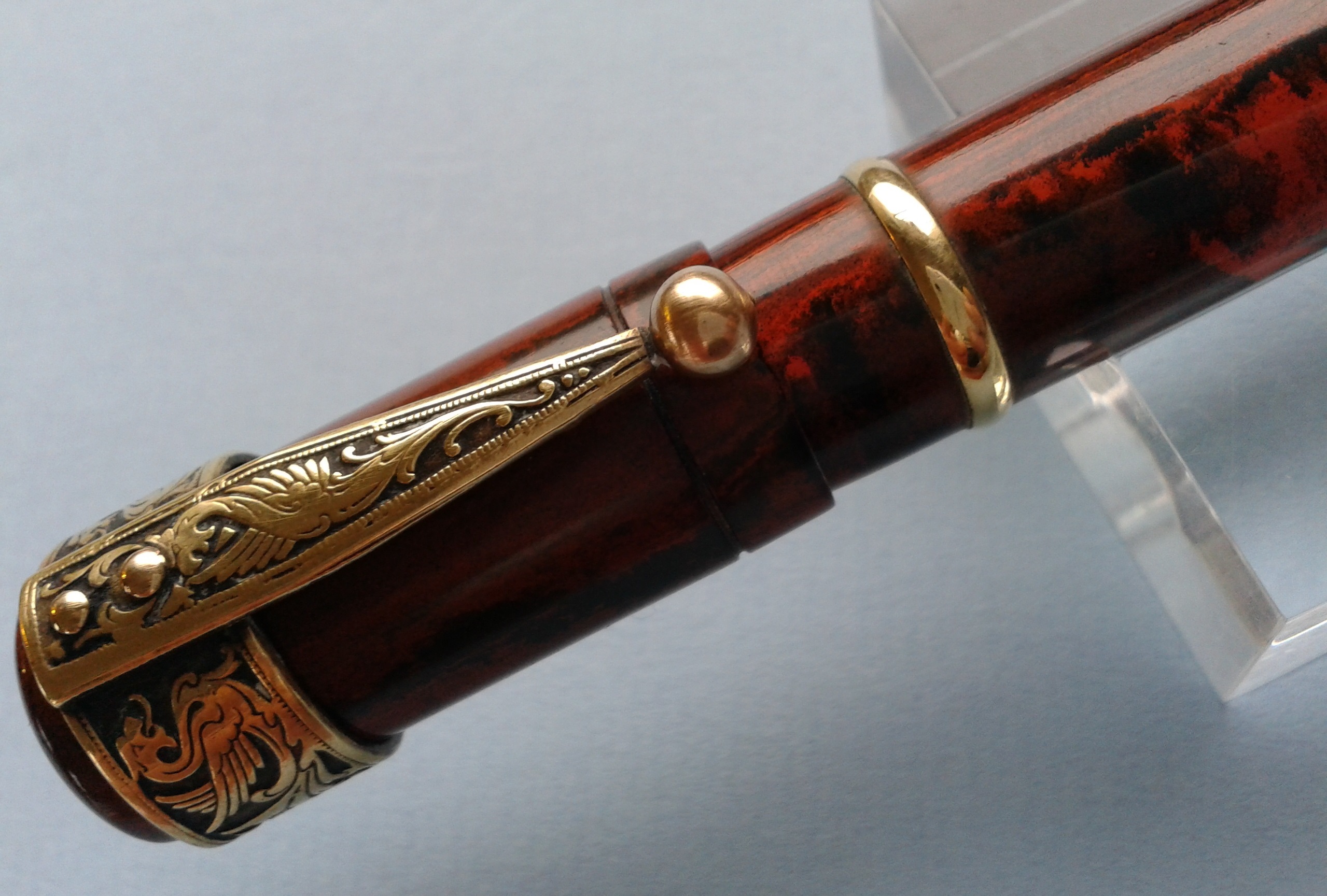 Foto di una penna Swell. Caricamento rientrante. Realizzazione in ebanite fiammata nero e perla. Modello ignoto con anelli e fermaglio di comodo in ottone, marca sconosciuta di origine francese. Contributo di Giorgio (utente forum Musicus).