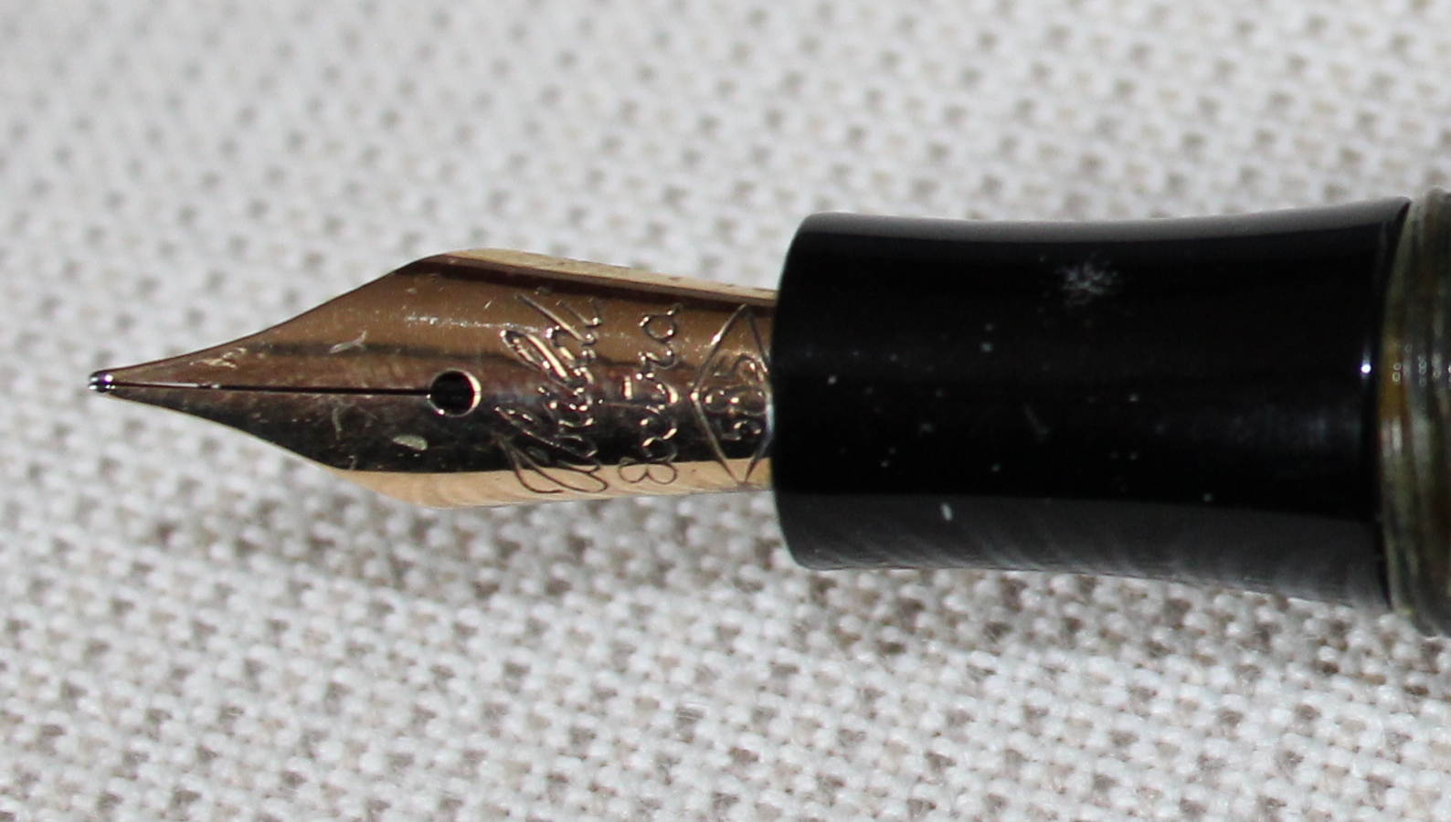 Photo of a pen produced by Tibaldi. Filling system: button filler. In gray ringed celluloid. Detail of nib. Medium size.