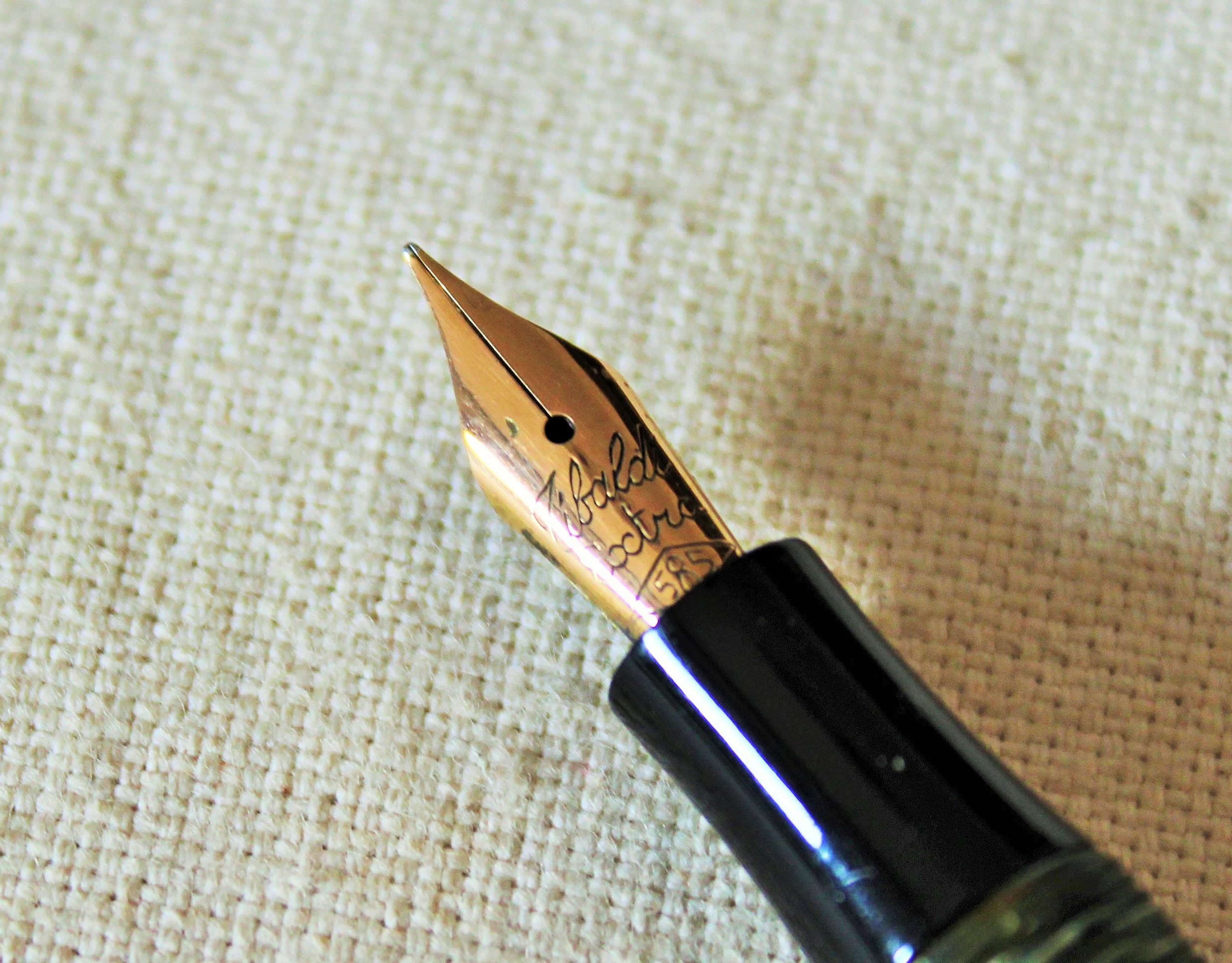 Photo of a pen produced by Tibaldi. Filling system: button filler. In gray ringed celluloid. Detail of nib. Medium size.
