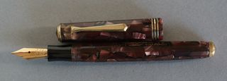 Photo of a pen produced by Tibaldi. Model: Rex. Filling system: twist filler. In marbled red celluloid. Medium size. Faceted model, tie clip.