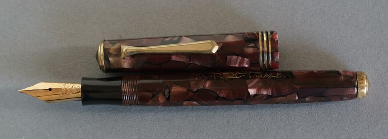 Foto di una penna Tibaldi. Modello: Rex. Caricamento a torsione. Realizzazione in celluloide marmorizzata rossa. Misura media. Modello sfaccettato, clip a cravatta. Contributo di Roberto Vetrugno (utente forum.fountainpen.it roberto v).