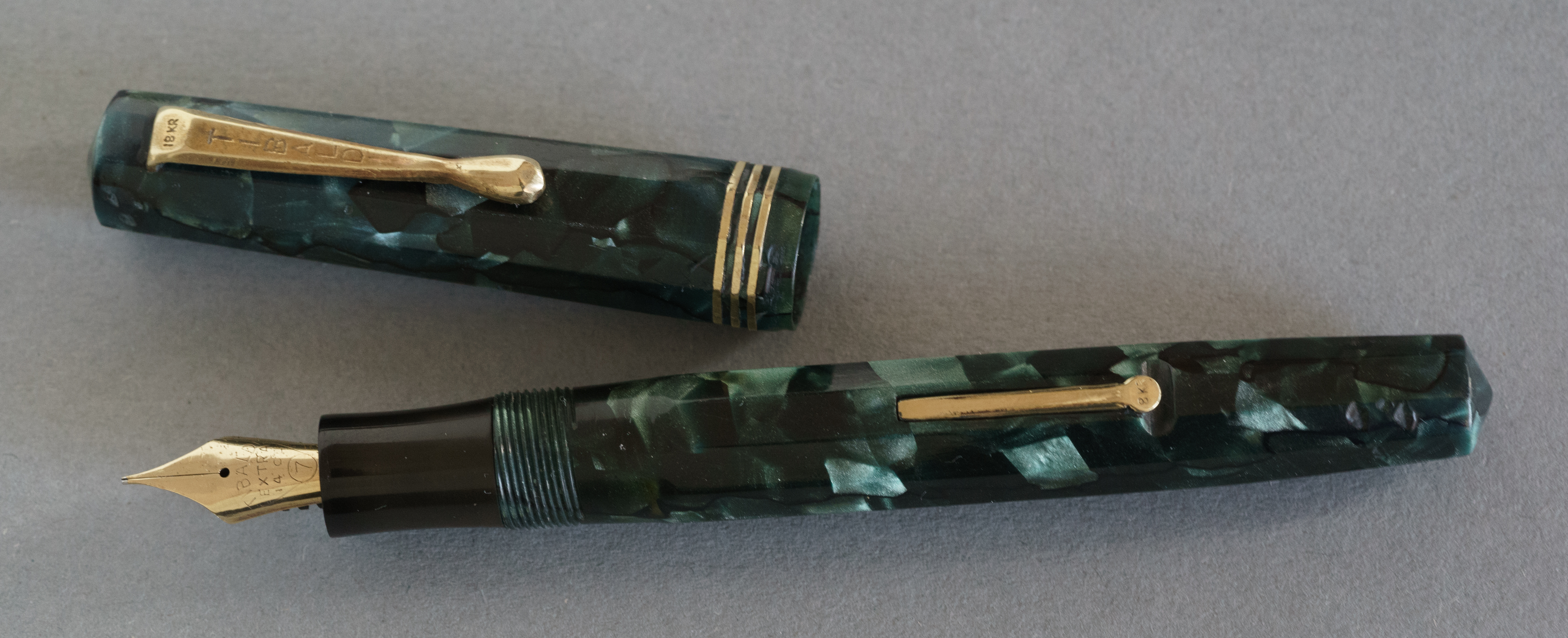 Photo of a pen produced by Tibaldi. Model: Rex. Filling system: lever filler. In marbled blue celluloid. Medium size. Faceted model, drop clip.