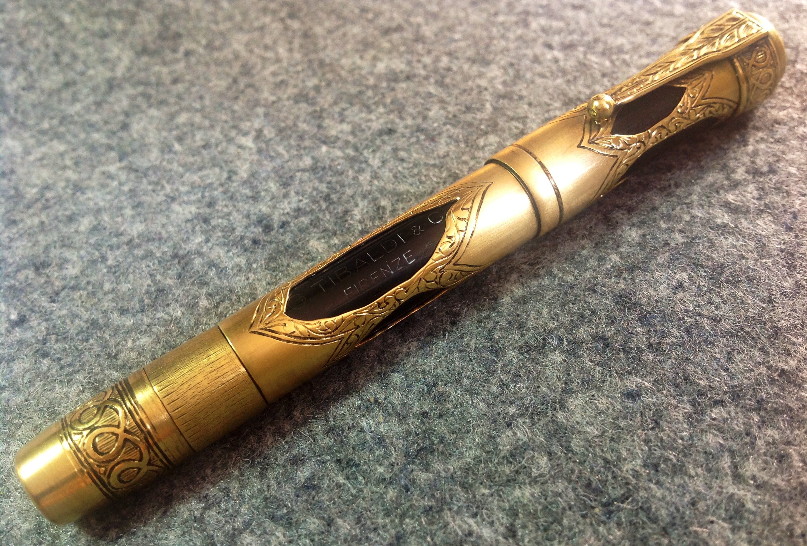 Foto di una penna Tibaldi. Caricamento rientrante. Realizzazione con rivestimento laminato traforato e inciso. Rivestimento ed accommodation clip lavorazione orafa dello stesso periodo. Contributo di Massimo, utente forum Maxpen2012.
