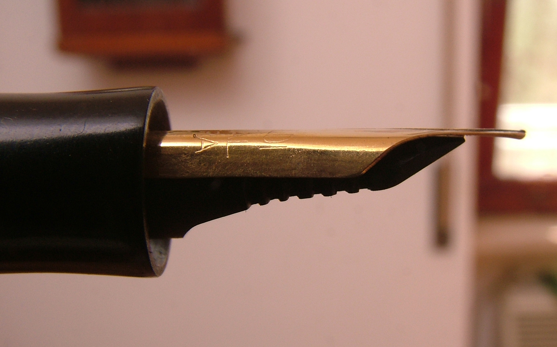 Photo of a pen produced by Tibaldi. Filling system: spring compressed by rotation. In black celluloid. Detail of nib. Detail of feeder. Unknown model, atypical filler. Rolled gold nib Iridal Extra, size 70.