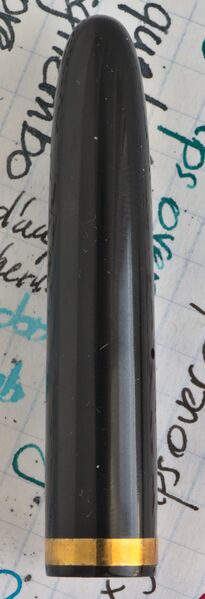 Photo of a pen produced by Tibaldi. Model: Tibaldi Trasp.M. Filling system: piston filler. In black celluloid. Detail of cap. Hooded nib model, marked "D-2333".