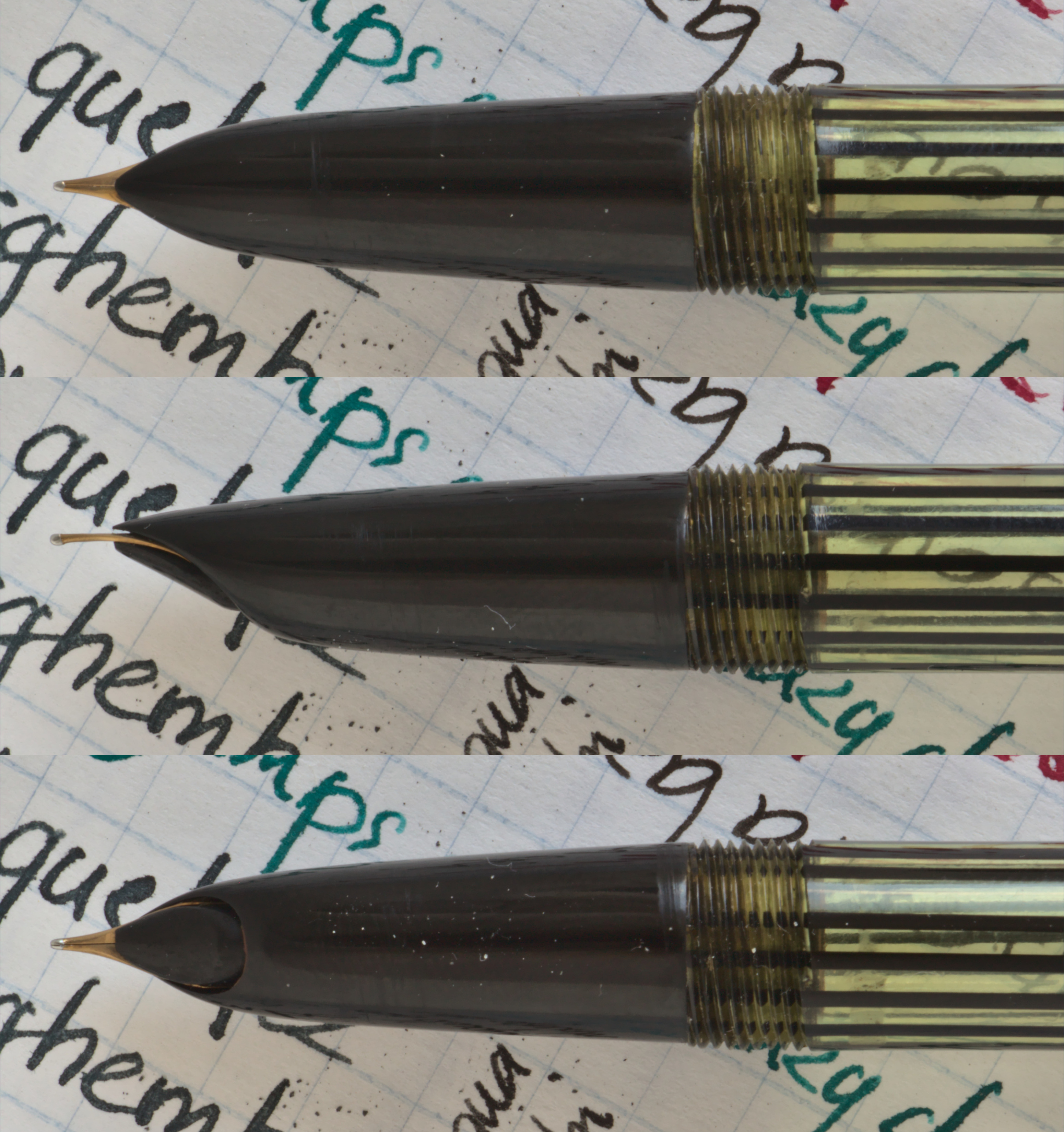 Foto di una penna Tibaldi. Modello: Tibaldi Trasp.M. Caricamento a stantuffo. Realizzazione in celluloide nera. Dettaglio del pennino. Dettaglio dell'alimentatore. Modello con pennino carenato, marcata "D-2333".