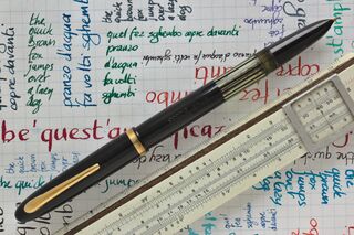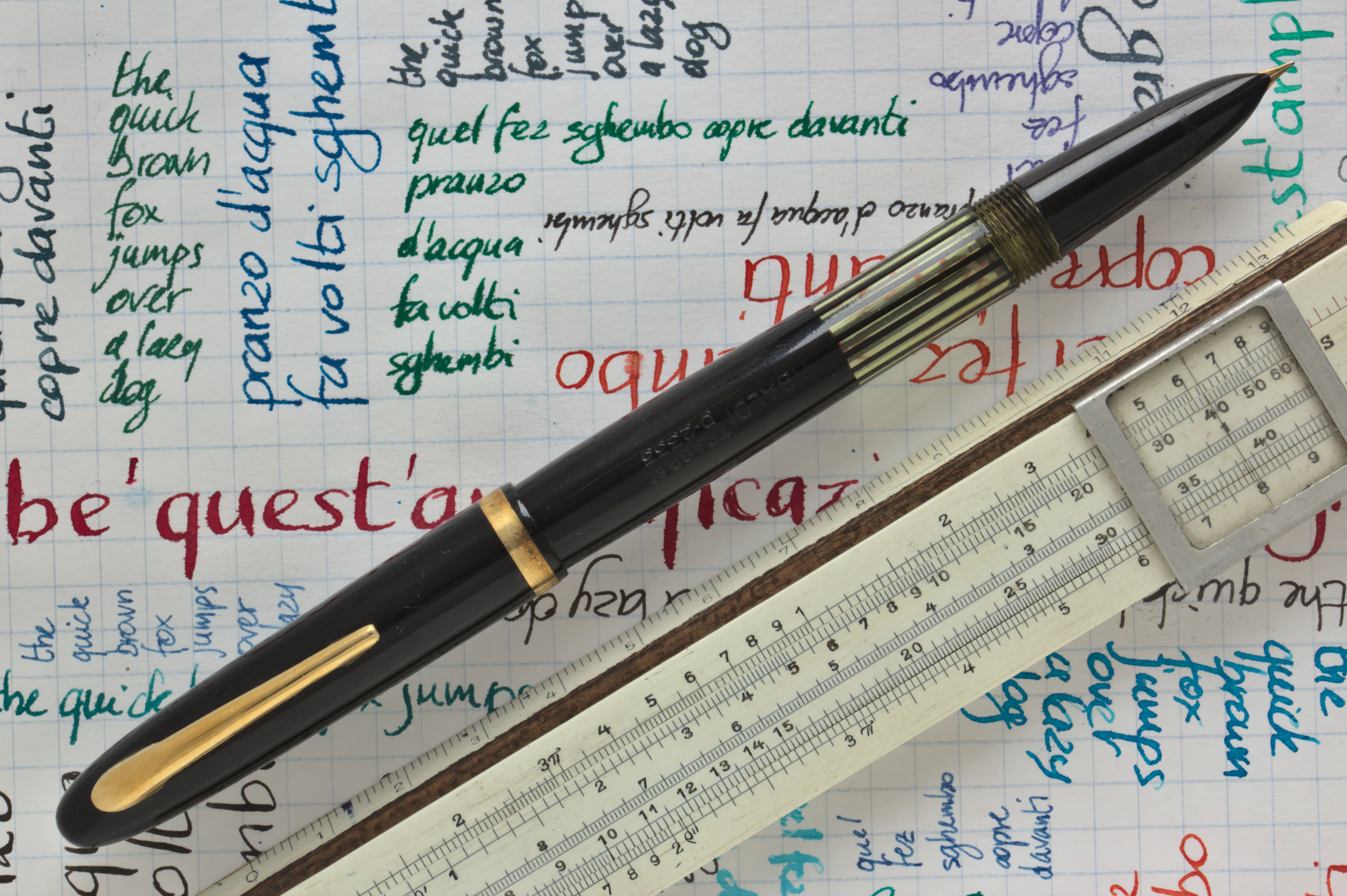 Foto di una penna Tibaldi. Modello: Tibaldi Trasp.M. Caricamento a stantuffo. Realizzazione in celluloide nera. Modello con pennino carenato, marcata "D-2333".