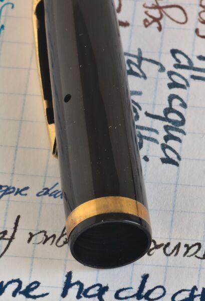 Photo of a pen produced by Tibaldi. Model: Tibaldi Trasp.M. Filling system: piston filler. In black celluloid. Detail of band. Hooded nib model, marked "D-2333".