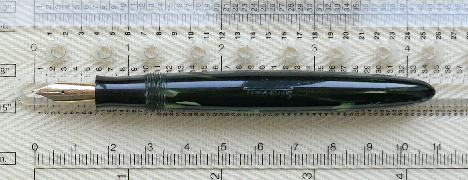 Foto di una penna Titanus. Caricamento a pulsante di fondo. Realizzazione in celluloide striata verde/nera. Modello non identificato. Contributo di Andrea (utente forum bisguillo).