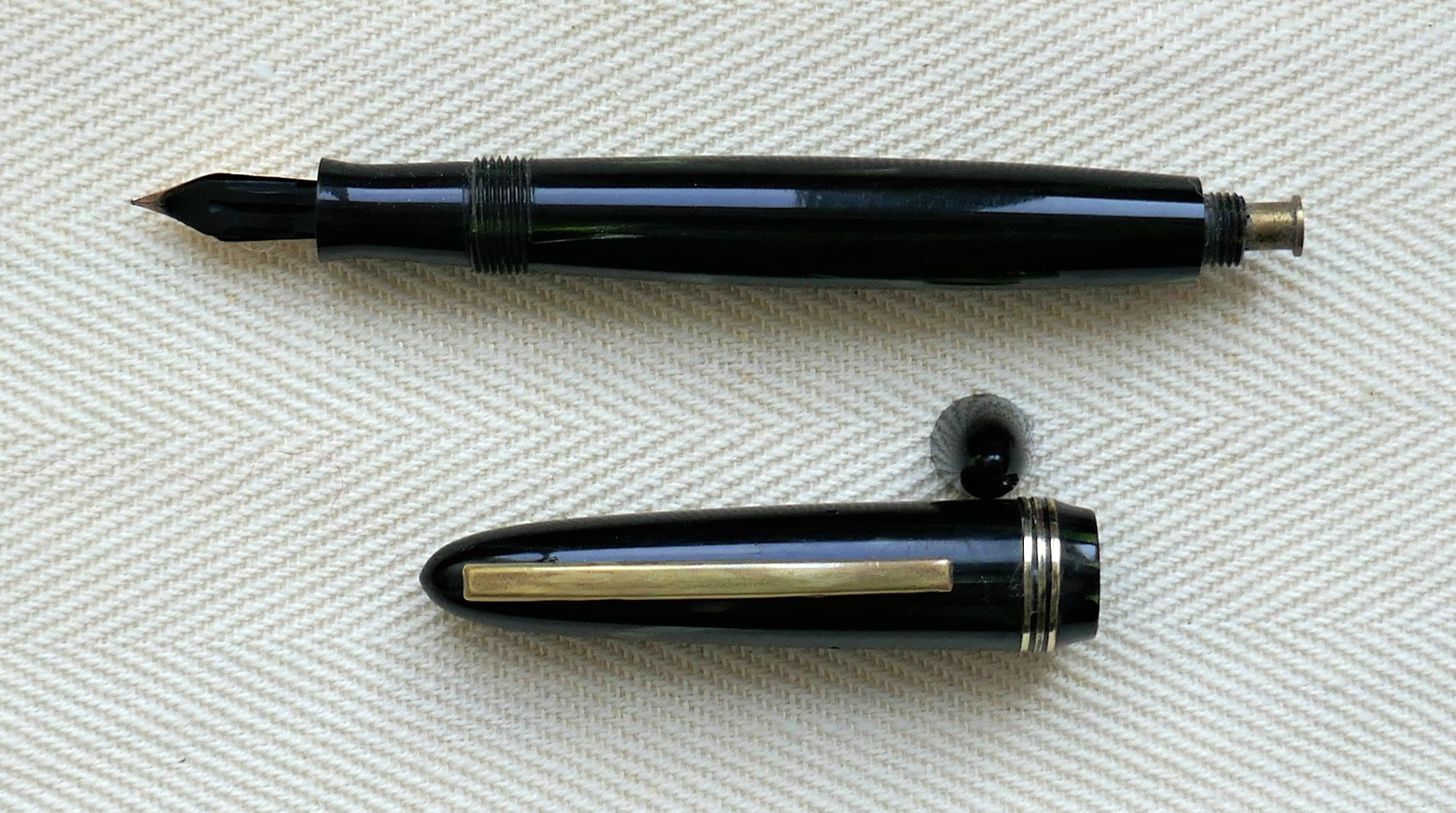 Photo of a pen produced by Titanus. Filling system: button filler. In ringed green/black celluloid. Unidentified model.