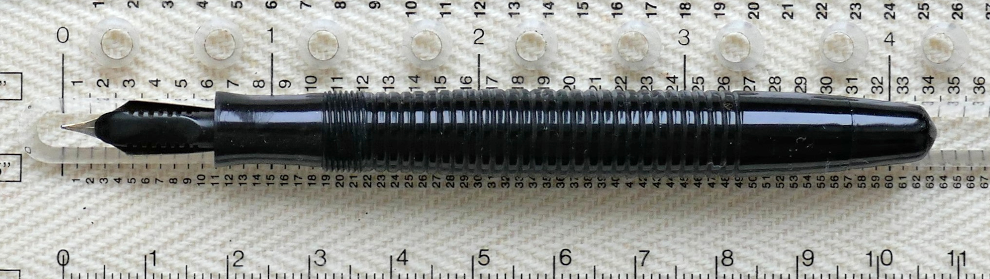 Foto di una penna Titanus. Caricamento a pulsante di fondo. Realizzazione in celluloide nera. Modello non identificato, in stile Hundred Year. Contributo di Andrea (utente forum bisguillo).