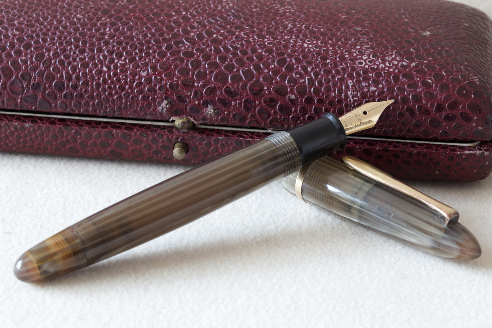 Photo of a pen produced by Tiziana Record. Filling system: button filler. In striped gray/brown celluloid. Streamlined model.
