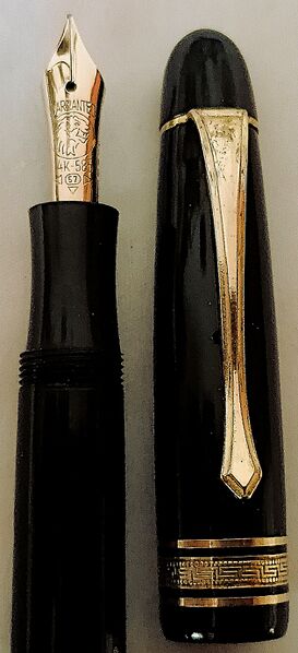 Foto di una penna Universal Füllhalter. Caricamento a stantuffo. Realizzazione in celluloide nera. Modello ignoto con finestra traparente di visualizzazione dell'inchiostro e pennino Rupp. Contributo di Lucio, (utente forum Lucio54).