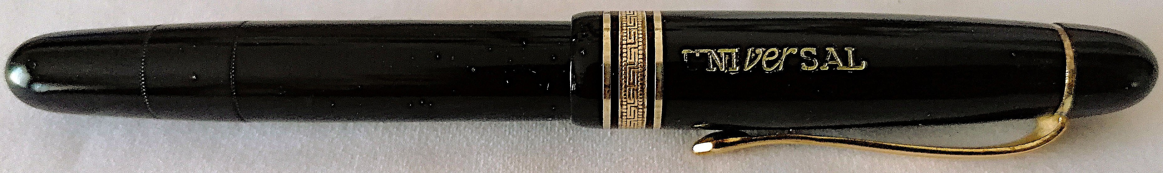 Foto di una penna Universal Füllhalter. Caricamento a stantuffo. Realizzazione in celluloide nera. Modello ignoto con finestra traparente di visualizzazione dell'inchiostro e pennino Rupp. Contributo di Lucio, (utente forum Lucio54).