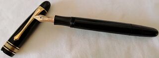 Foto di una penna Universal Füllhalter. Caricamento a stantuffo. Realizzazione in celluloide nera. Modello ignoto con finestra traparente di visualizzazione dell'inchiostro e pennino Rupp. Contributo di Lucio, (utente forum Lucio54).