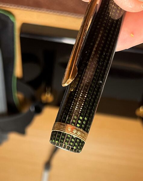 Foto di una penna Union Vulpenhouderfabriek. Modello: Airless 77. Caricamento a stantuffo. Realizzazione in celluloide a righe quadrettate verdi. Dettaglio del cappuccio. Dettaglio della veretta. Modello marcato Union - 77 sul fusto, e Airless sull'anello del cappuccio. Contributo di Jaconib.