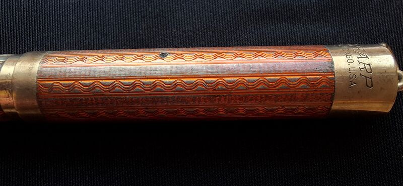 Foto di una penna Eversharp. Modello: Wahl Metal Pen. Caricamento a levetta. Realizzazione in vermeil con lavorazione guilloché a smalto rosso. Dettaglio del cappuccio. Misura piccola, da signora, nella lavorazione Tinted, versione smaltata in rosso, codice X3218R. Contributo di Giorgio (utente forum Musicus).