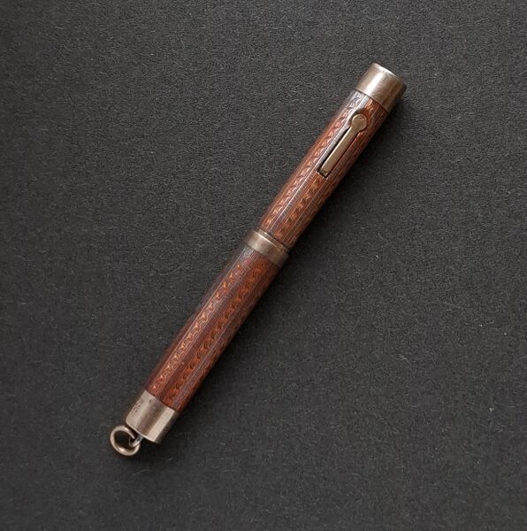 Foto di una penna Eversharp. Modello: Wahl Metal Pen. Caricamento a levetta. Realizzazione in vermeil con lavorazione guilloché a smalto rosso. Misura piccola, da signora, nella lavorazione Tinted, versione smaltata in rosso, codice X3218R. Contributo di Giorgio (utente forum Musicus).