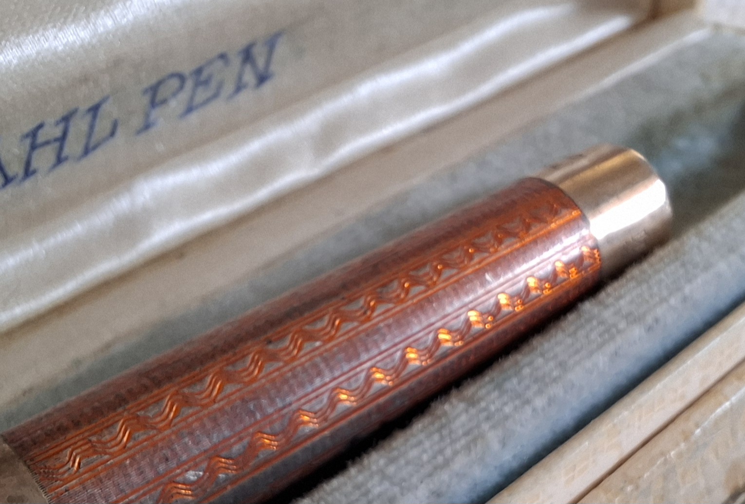 Foto di una penna Eversharp. Modello: Wahl Metal Pen. Caricamento a levetta. Realizzazione in vermeil con lavorazione guilloché a smalto rosso. Misura piccola, da signora, nella lavorazione Tinted, versione smaltata in rosso, codice X3218R. Contributo di Giorgio (utente forum Musicus).