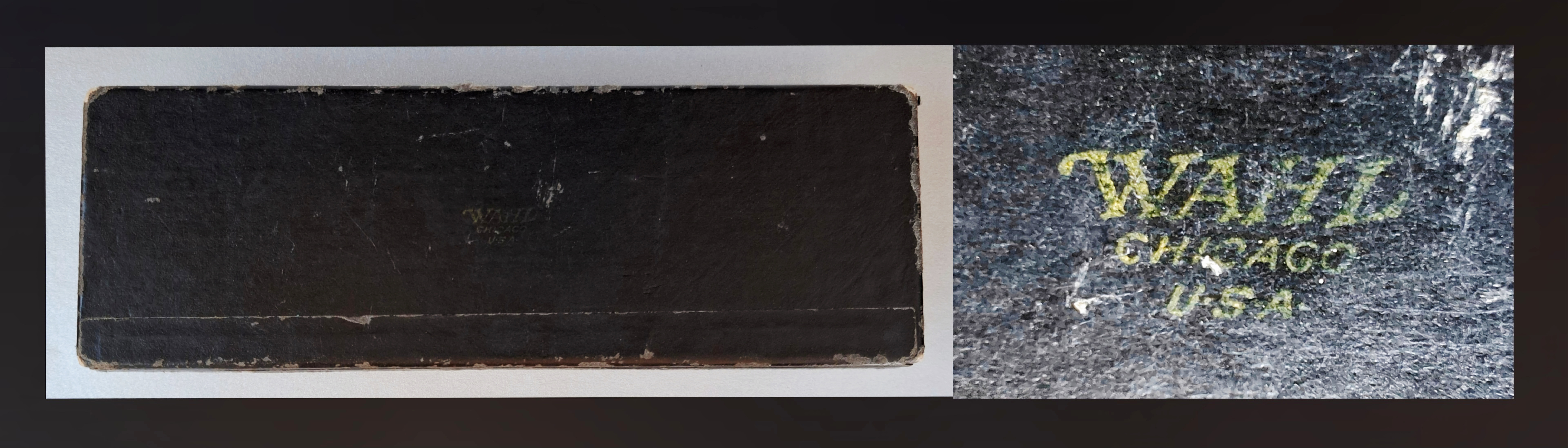 Photo of a pen produced by Eversharp. Model: Equi-Poised. Filling system: lever filler. In "Black and Pearl" celluloid. Detail of box. First version, retired almost immediately.