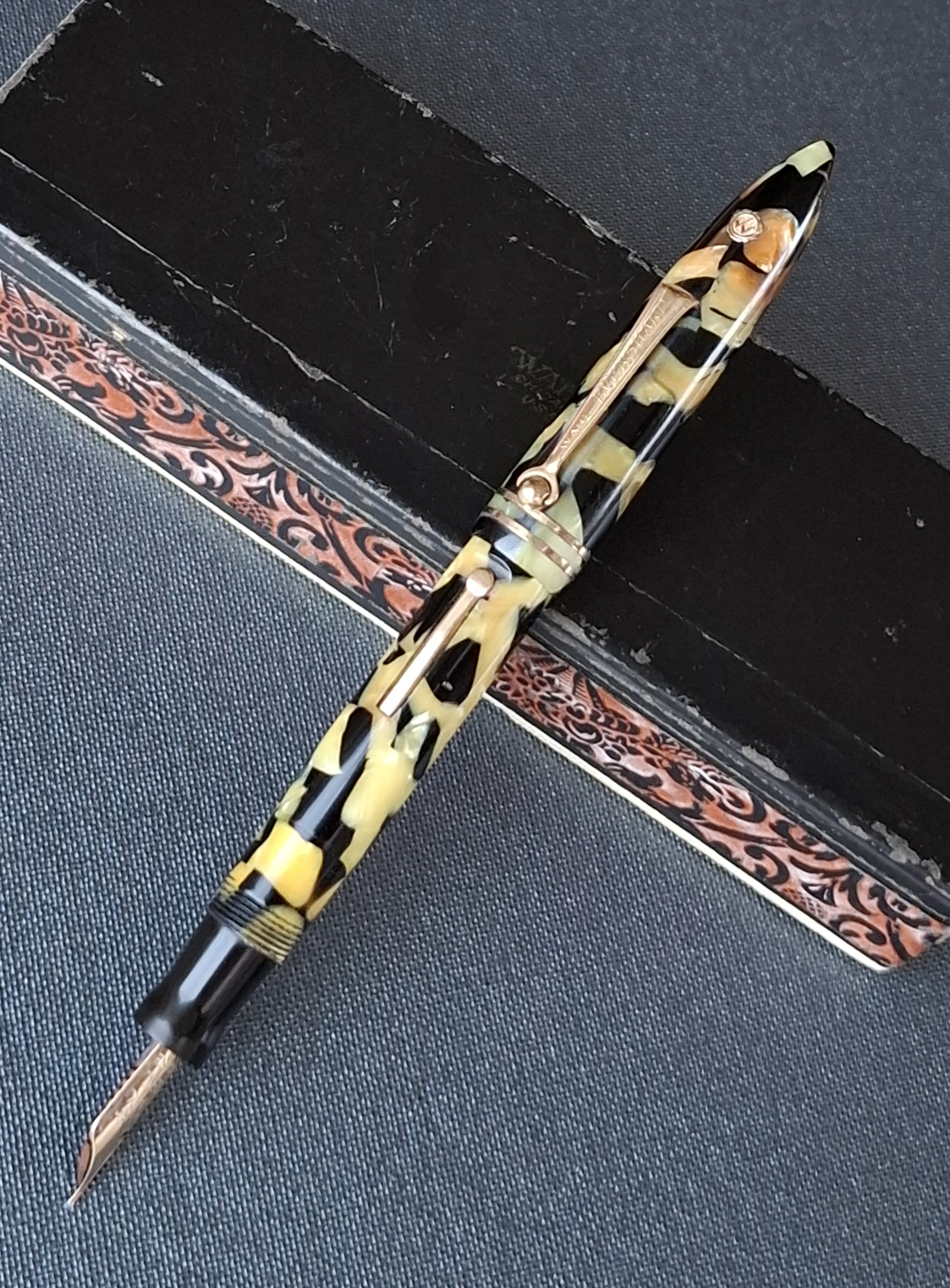 Foto di una penna Eversharp. Modello: Equi-Poised. Caricamento a levetta. Realizzazione in celluloide "Black and Pearl". Prima versione, ritirata quasi subito dal commercio. Contributo di Giorgio (utente forum Musicus).