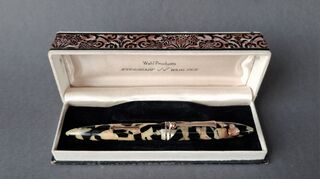 Photo of a pen produced by Eversharp. Model: Equi-Poised. Filling system: lever filler. In "Black and Pearl" celluloid. First version, retired almost immediately.