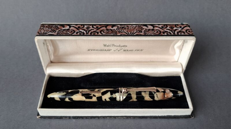 Foto di una penna Eversharp. Modello: Equi-Poised. Caricamento a levetta. Realizzazione in celluloide "Black and Pearl". Prima versione, ritirata quasi subito dal commercio. Contributo di Giorgio (utente forum Musicus).