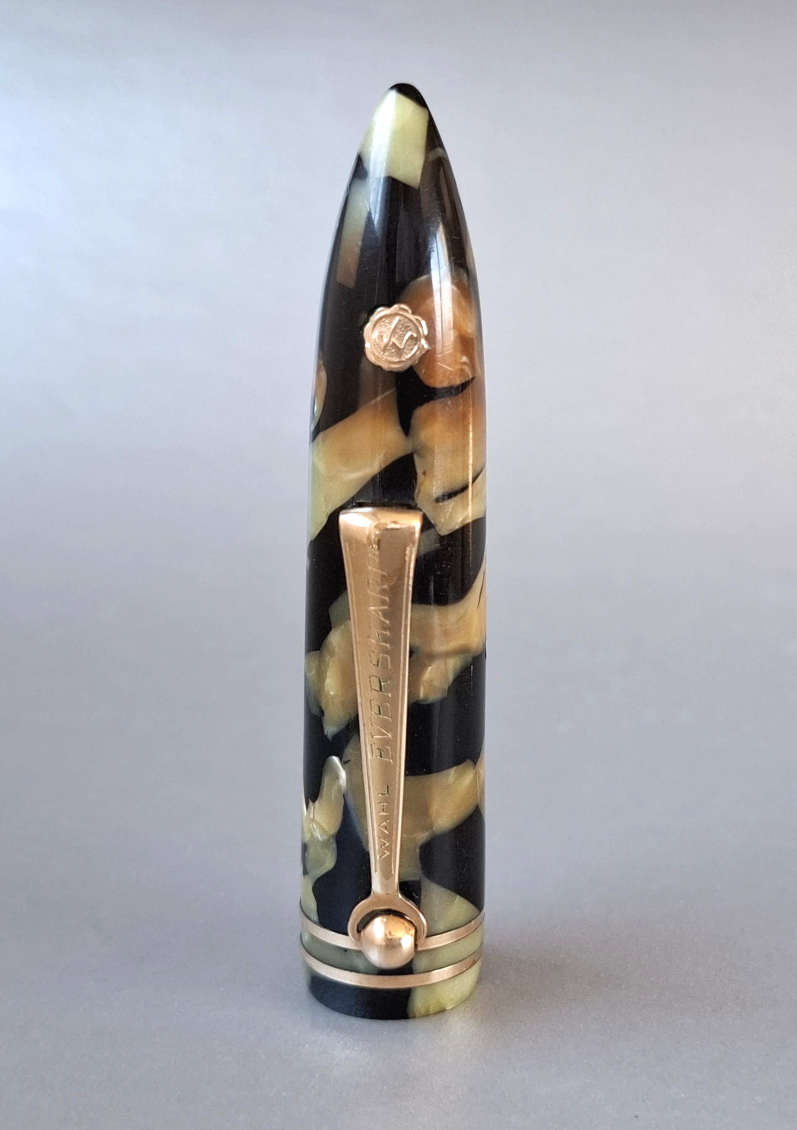 Foto di una penna Eversharp. Modello: Equi-Poised. Caricamento a levetta. Realizzazione in celluloide "Black and Pearl". Dettaglio del cappuccio. Prima versione, ritirata quasi subito dal commercio. Contributo di Giorgio (utente forum Musicus).
