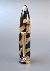 Photo of a pen produced by Eversharp. Model: Equi-Poised. Filling system: lever filler. In "Black and Pearl" celluloid. Detail of cap. First version, retired almost immediately.
