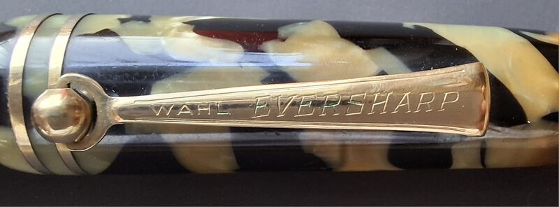 Foto di una penna Eversharp. Modello: Equi-Poised. Caricamento a levetta. Realizzazione in celluloide "Black and Pearl". Dettaglio del fermaglio. Prima versione, ritirata quasi subito dal commercio. Contributo di Giorgio (utente forum Musicus).