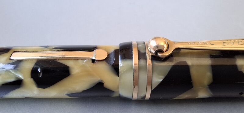 Foto di una penna Eversharp. Modello: Equi-Poised. Caricamento a levetta. Realizzazione in celluloide "Black and Pearl". Dettaglio della levetta. Prima versione, ritirata quasi subito dal commercio. Contributo di Giorgio (utente forum Musicus).