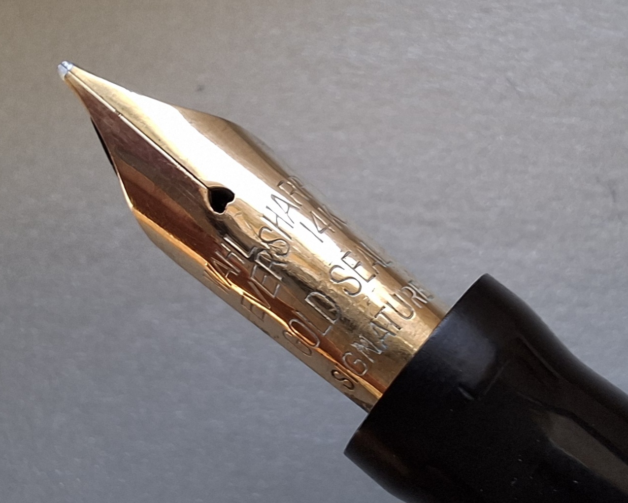 Foto di una penna Eversharp. Modello: Equi-Poised. Caricamento a levetta. Realizzazione in celluloide "Black and Pearl". Dettaglio del pennino. Prima versione, ritirata quasi subito dal commercio. Contributo di Giorgio (utente forum Musicus).