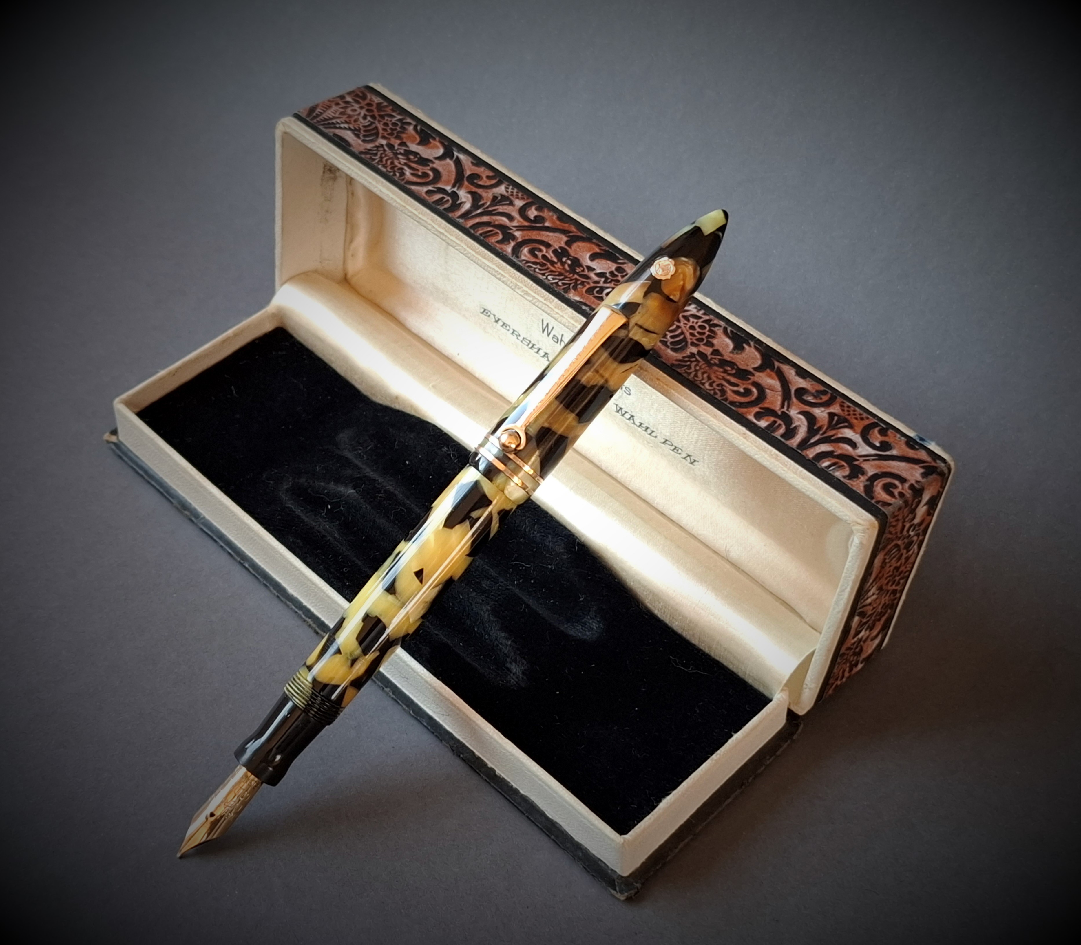Foto di una penna Eversharp. Modello: Equi-Poised. Caricamento a levetta. Realizzazione in celluloide "Black and Pearl". Prima versione, ritirata quasi subito dal commercio. Contributo di Giorgio (utente forum Musicus).