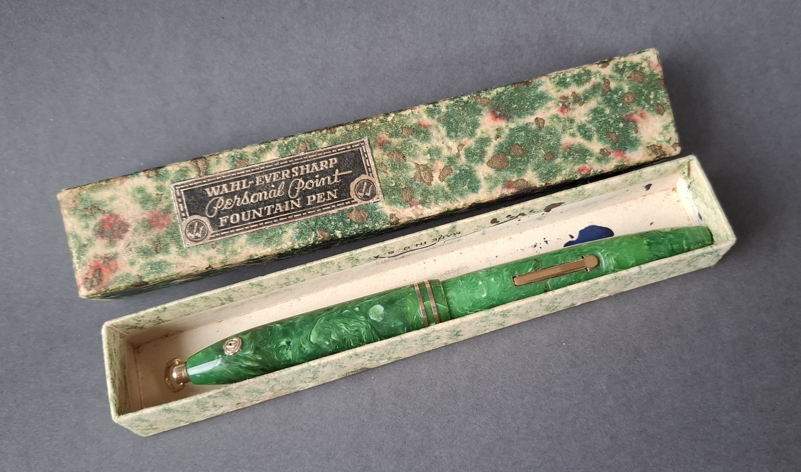 Foto di una penna Eversharp. Modello: Equi-Poised. Caricamento a levetta. Realizzazione in celluloide "Jade Green". Seconda versione di transizione. Contributo di Giorgio (utente forum Musicus).