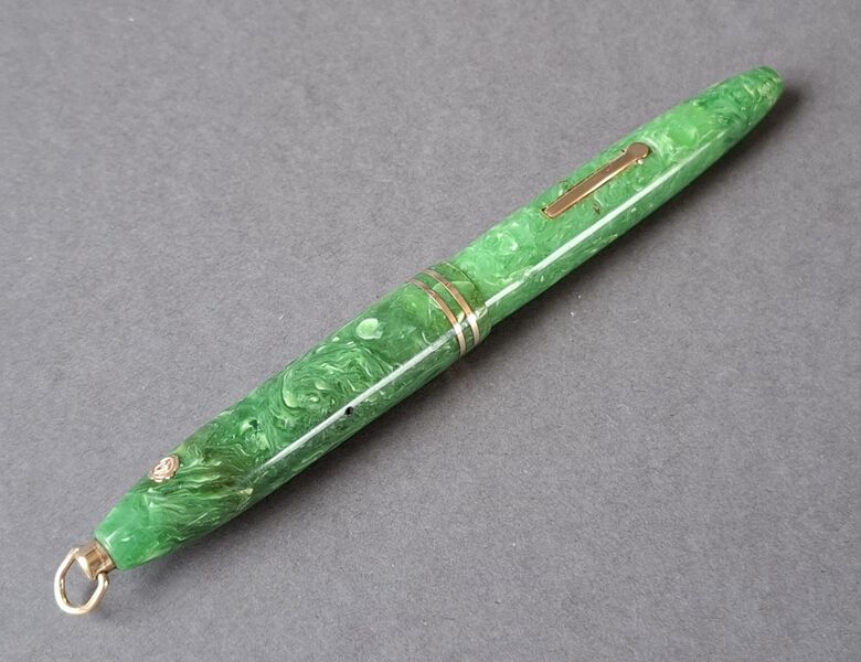 Photo of a pen produced by Eversharp. Model: Equi-Poised. Filling system: lever filler. In "Jade Green" celluloid. Second transition version.