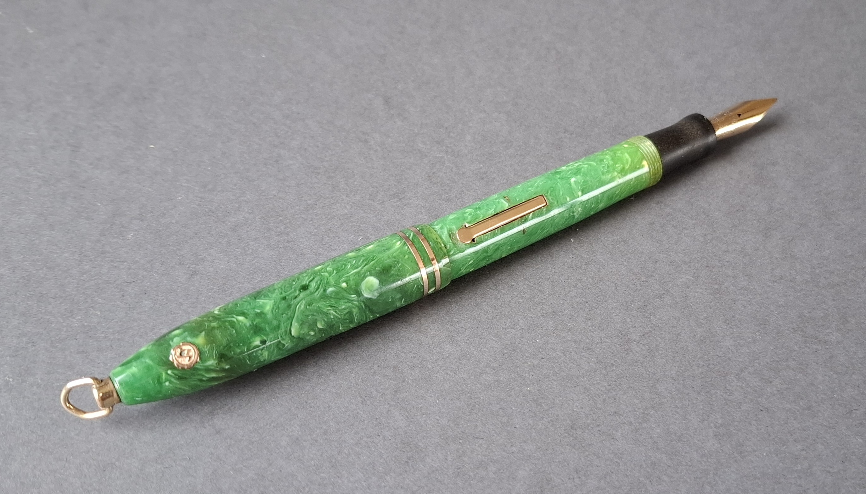 Foto di una penna Eversharp. Modello: Equi-Poised. Caricamento a levetta. Realizzazione in celluloide "Jade Green". Seconda versione di transizione. Contributo di Giorgio (utente forum Musicus).