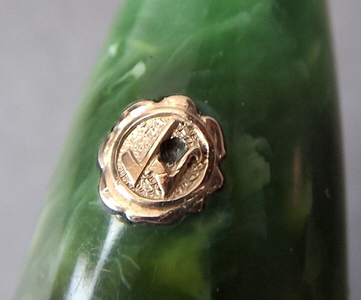 Foto di una penna Eversharp. Modello: Equi-Poised. Caricamento a levetta. Realizzazione in celluloide "Jade Green". Dettaglio del cappuccio. Seconda versione di transizione. Contributo di Giorgio (utente forum Musicus).