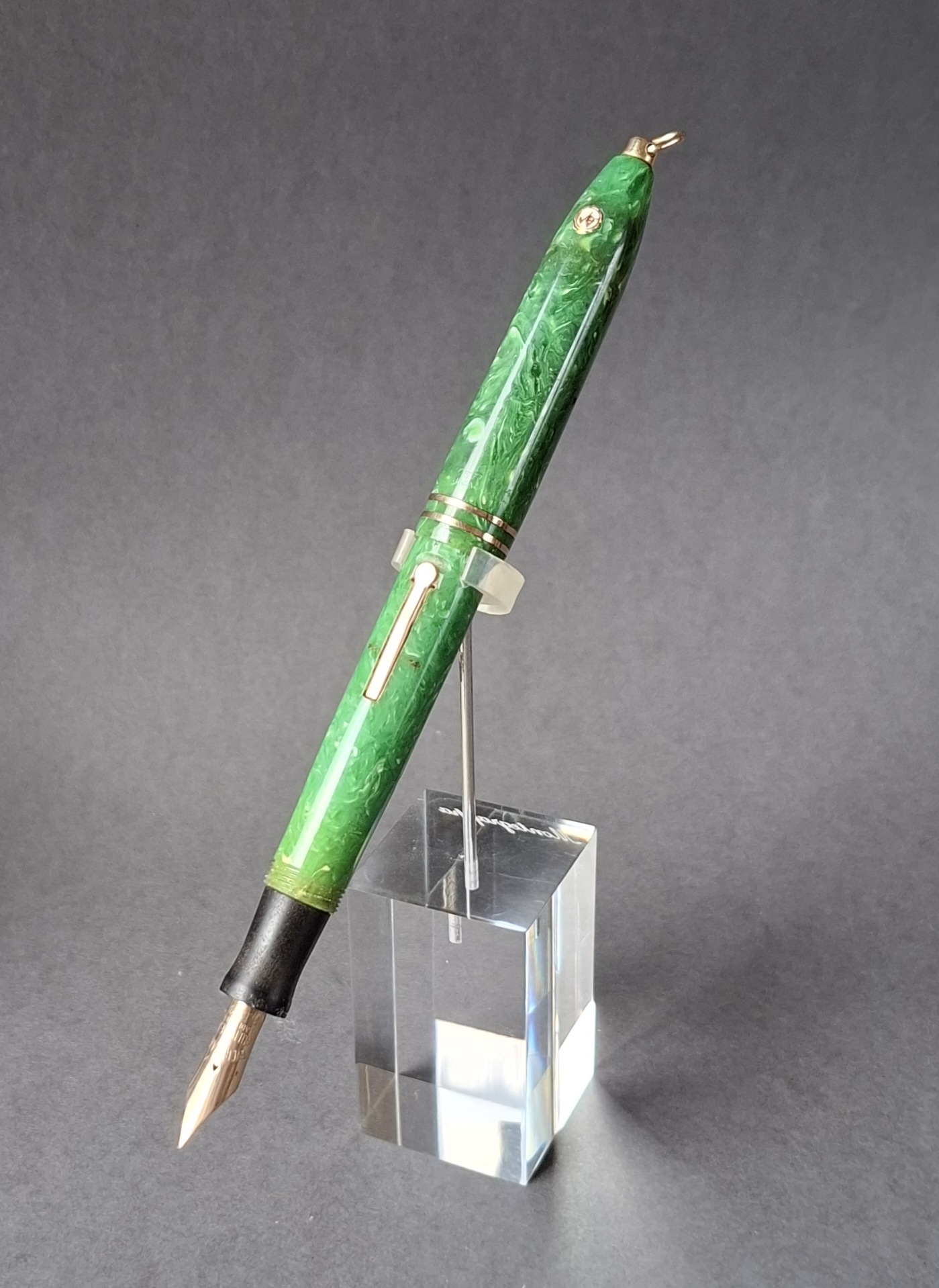 Photo of a pen produced by Eversharp. Model: Equi-Poised. Filling system: lever filler. In "Jade Green" celluloid. Second transition version.