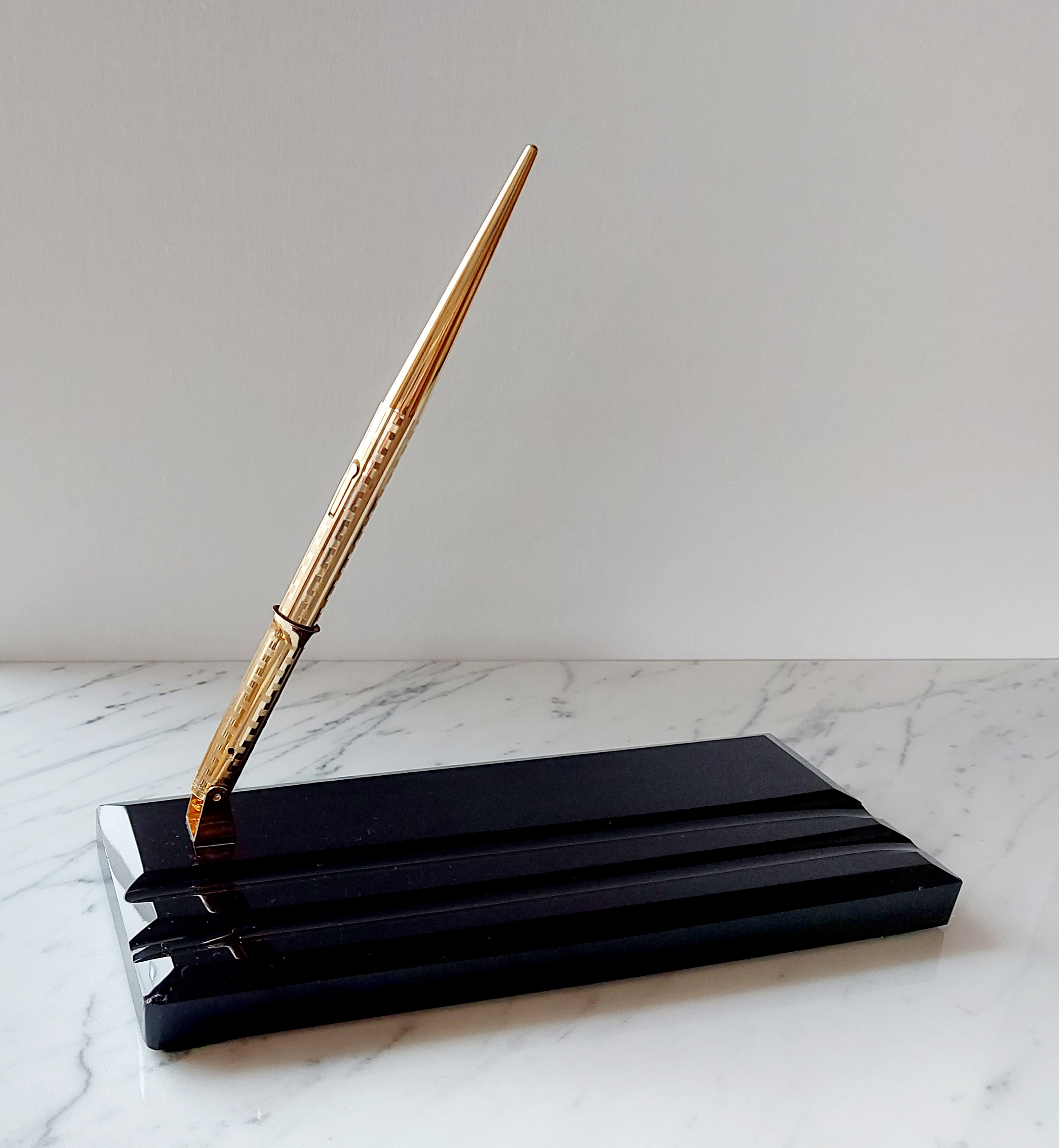 Foto di una penna Eversharp. Modello: Wahl Fountain Pen Desk Set. Caricamento a levetta. Realizzazione in metallo laminato oro con lavorazione guilloché. Base in vetro nero, versione con penna in stille Wahl All-Metal nella lavorazione Grecian Border. Contributo di Giorgio (utente forum Musicus).