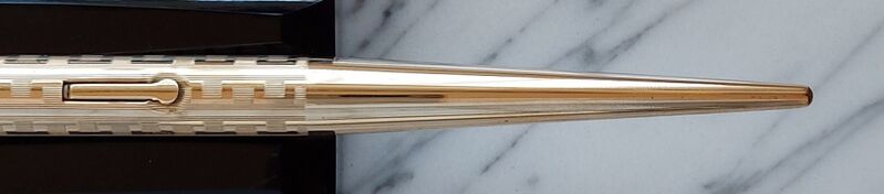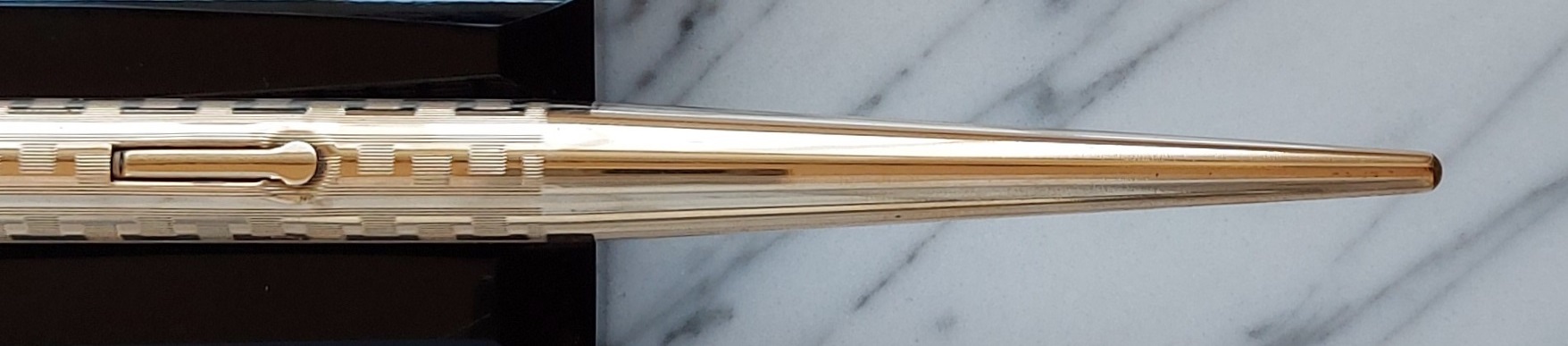 Foto di una penna Eversharp. Modello: Wahl Fountain Pen Desk Set. Caricamento a levetta. Realizzazione in metallo laminato oro con lavorazione guilloché. Base in vetro nero, versione con penna in stille Wahl All-Metal nella lavorazione Grecian Border. Contributo di Giorgio (utente forum Musicus).
