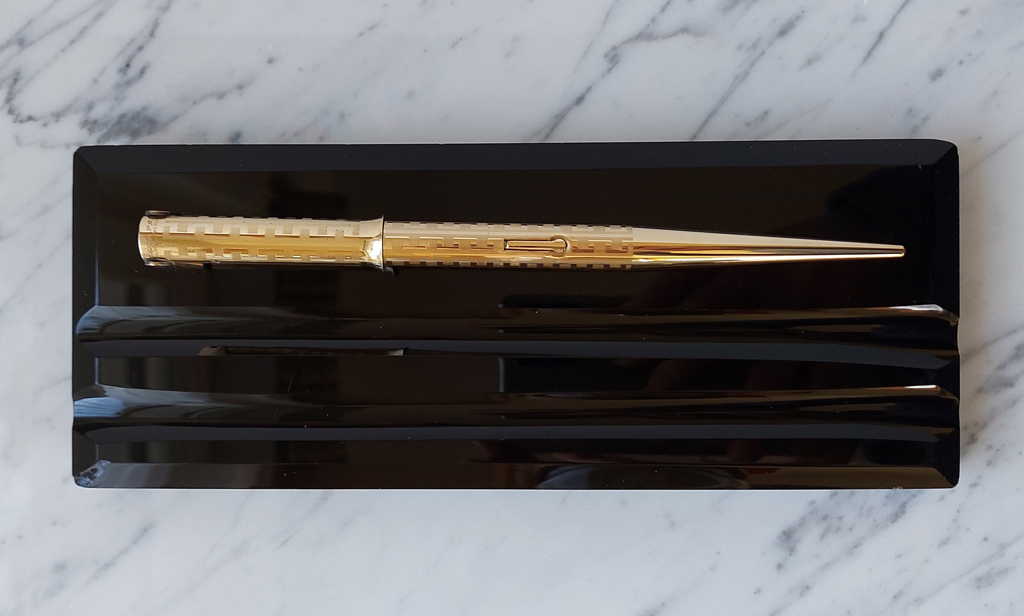 Foto di una penna Eversharp. Modello: Wahl Fountain Pen Desk Set. Caricamento a levetta. Realizzazione in metallo laminato oro con lavorazione guilloché. Base in vetro nero, versione con penna in stille Wahl All-Metal nella lavorazione Grecian Border. Contributo di Giorgio (utente forum Musicus).