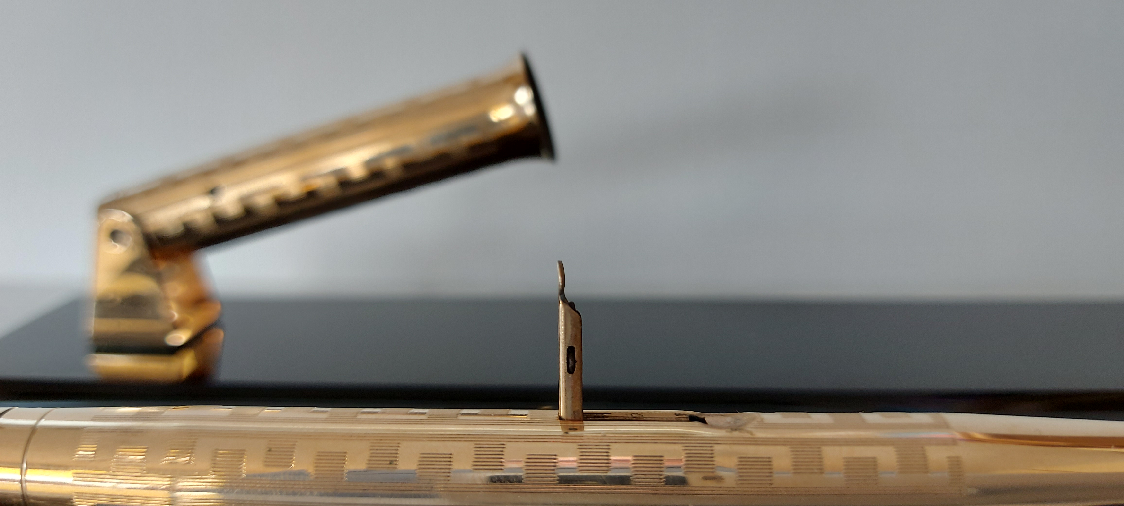 Foto di una penna Eversharp. Modello: Wahl Fountain Pen Desk Set. Caricamento a levetta. Realizzazione in metallo laminato oro con lavorazione guilloché. Dettaglio della levetta. Base in vetro nero, versione con penna in stille Wahl All-Metal nella lavorazione Grecian Border. Contributo di Giorgio (utente forum Musicus).