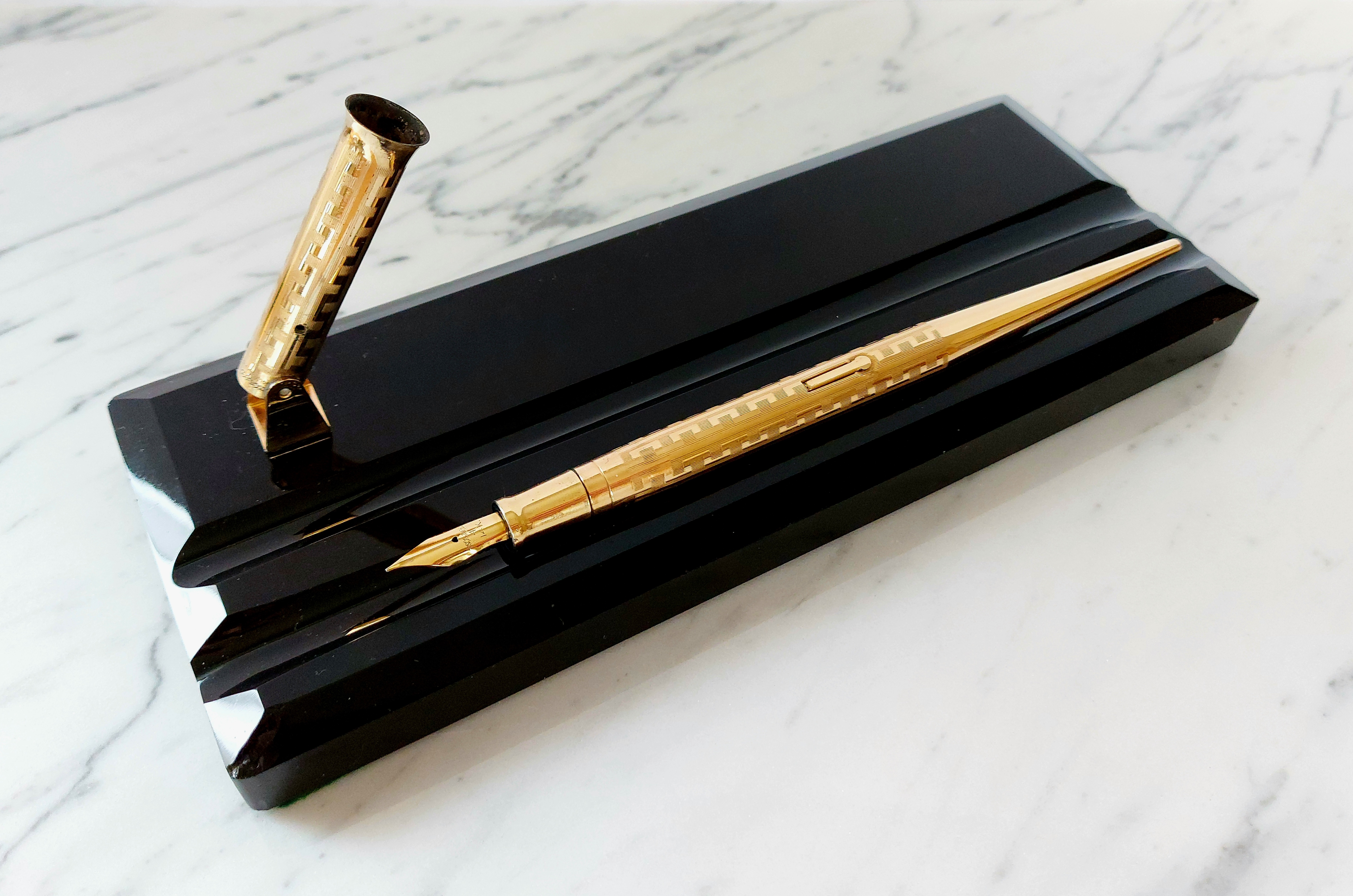 Foto di una penna Eversharp. Modello: Wahl Fountain Pen Desk Set. Caricamento a levetta. Realizzazione in metallo laminato oro con lavorazione guilloché. Base in vetro nero, versione con penna in stille Wahl All-Metal nella lavorazione Grecian Border. Contributo di Giorgio (utente forum Musicus).