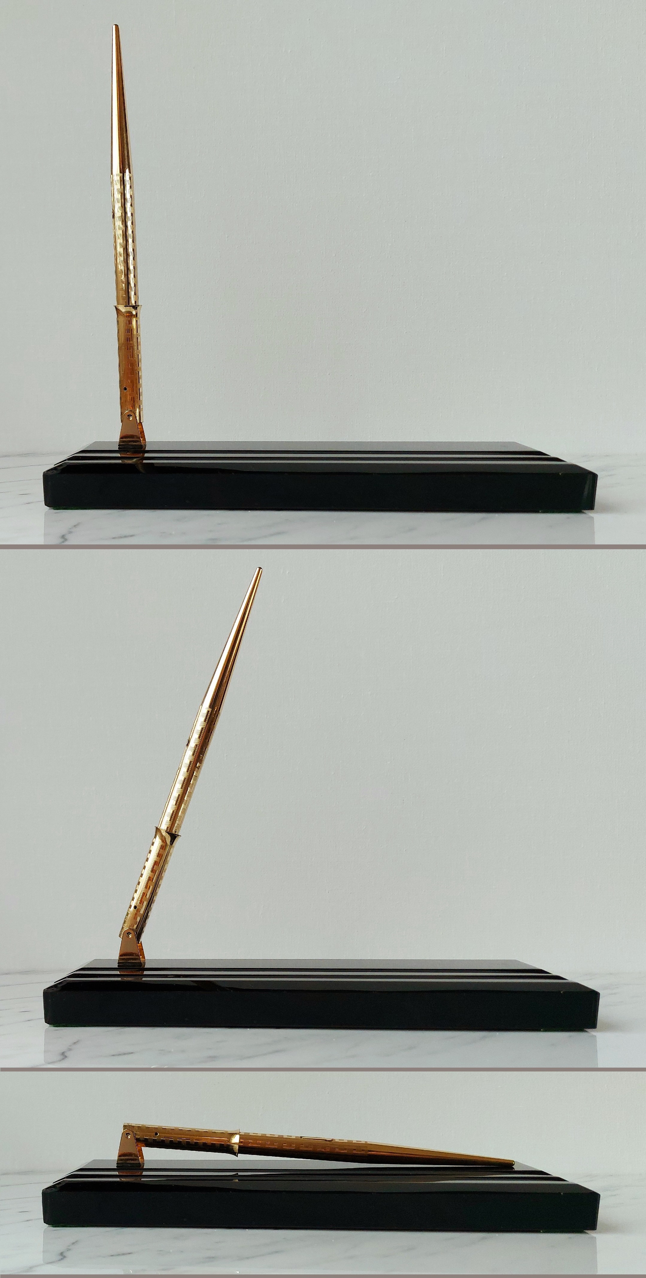 Foto di una penna Eversharp. Modello: Wahl Fountain Pen Desk Set. Caricamento a levetta. Realizzazione in metallo laminato oro con lavorazione guilloché. Base in vetro nero, versione con penna in stille Wahl All-Metal nella lavorazione Grecian Border. Contributo di Giorgio (utente forum Musicus).