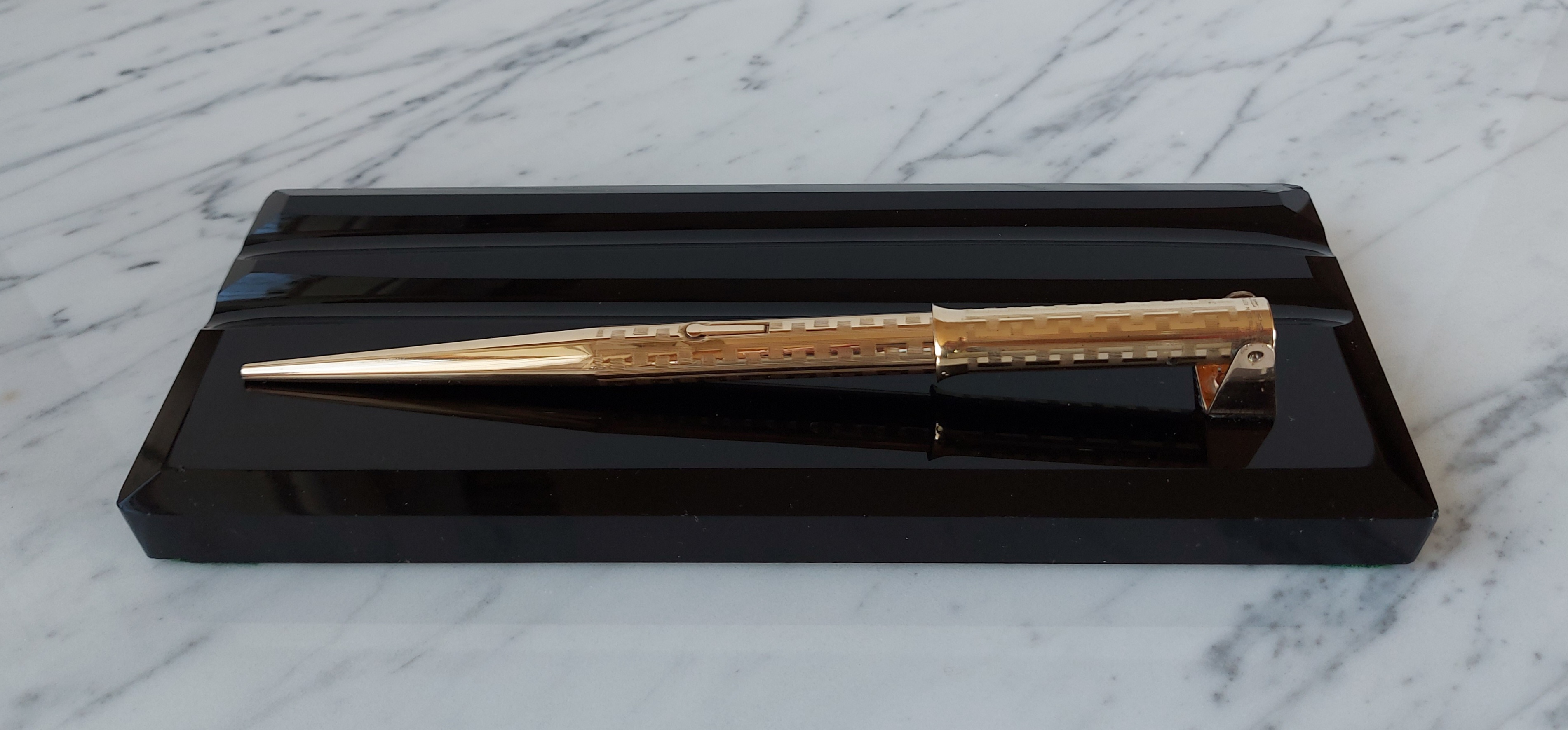 Foto di una penna Eversharp. Modello: Wahl Fountain Pen Desk Set. Caricamento a levetta. Realizzazione in metallo laminato oro con lavorazione guilloché. Base in vetro nero, versione con penna in stille Wahl All-Metal nella lavorazione Grecian Border. Contributo di Giorgio (utente forum Musicus).