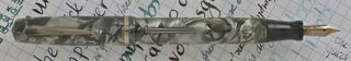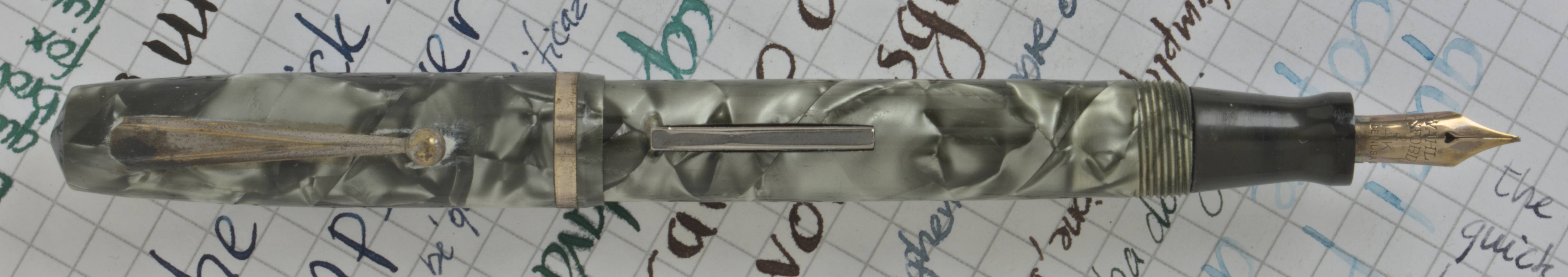 Photo of a pen produced by Oxford (sub-band of Wahl Eversharp). Model: Wahl Oxford. Filling system: lever filler. In gray marbled celluloid. Second serie of Wahl Oxford pens, more rounded shape. Version with horizontal imprint.