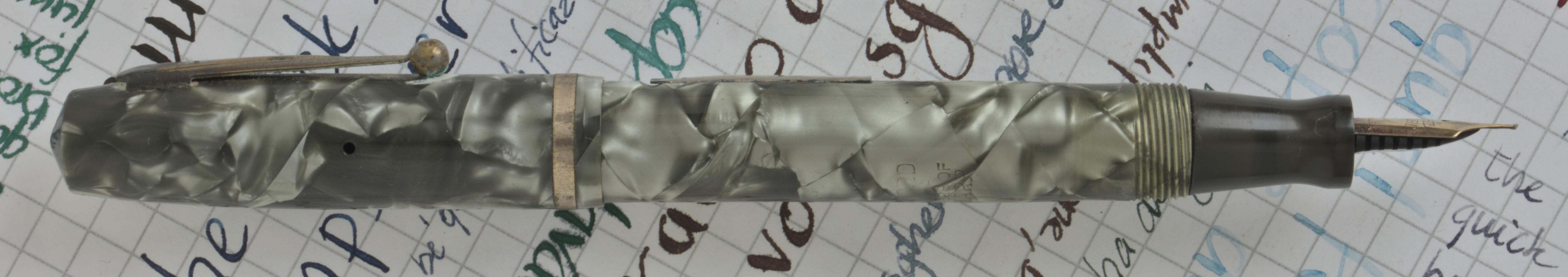 Photo of a pen produced by Oxford (sub-band of Wahl Eversharp). Model: Wahl Oxford. Filling system: lever filler. In gray marbled celluloid. Second serie of Wahl Oxford pens, more rounded shape. Version with horizontal imprint.