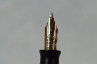 Photo of a pen produced by Waterman. Model: Waterman 512V. Filling system: lever filler. In striated blue celluloid. Detail of nib. English production model.